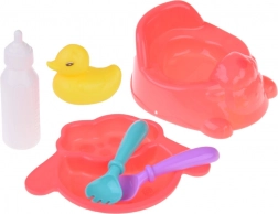 Dette sæt med børnelegetøj tilbyder alt, hvad en lille mor har brug for til at passe sine dukker. Det indeholder basisværktøjer til rollespil, såsom en potte, en tallerken med ske og gaffel, og også forskellige flasker og en and til badning. Hver af disse rekvisitter er designet til at fremme børns fantasi og motorik.