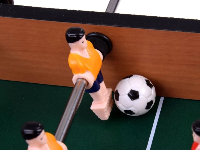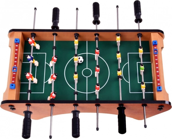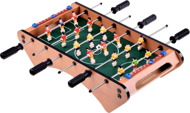 Spillefladen på 41,5 × 23,5 cm giver rigelig plads til hurtigt spil. Bordet er af solidt træ, spillerne, boldene og tilbehøret af holdbar plast – en perfekt kombination for lang levetid og nem vedligeholdelse.