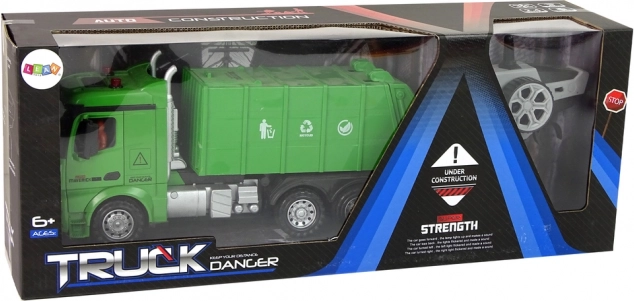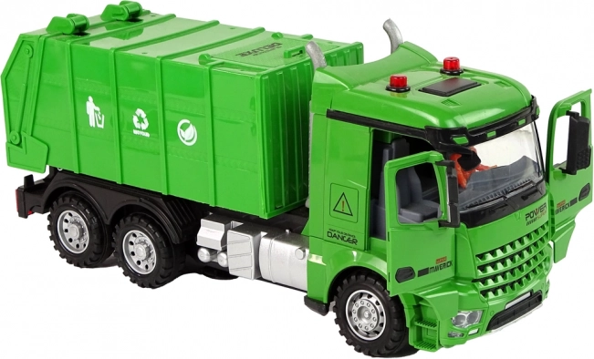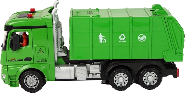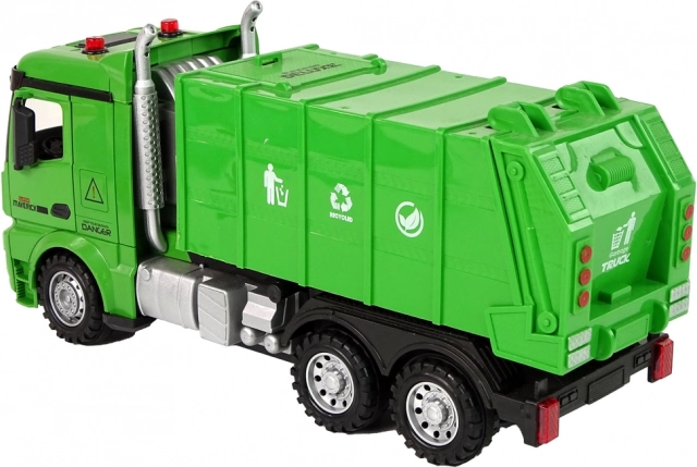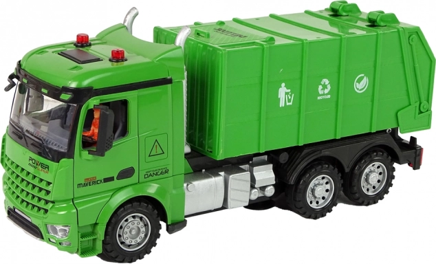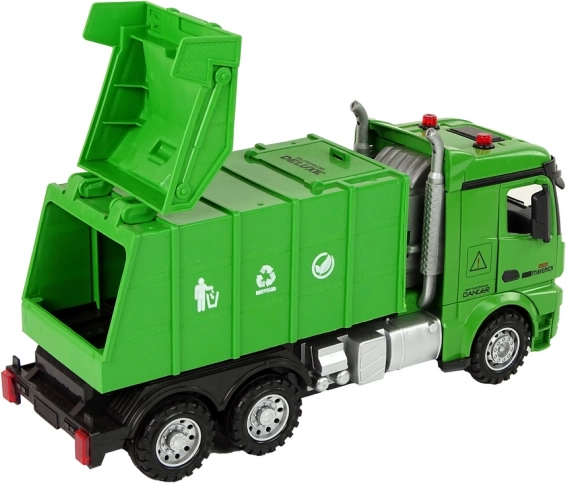Denne fjernstyrede skraldebil i grøn med genbrugssymboler efterligner trofast et rigtigt køretøj. Børn vil nyde realistiske effekter – forlygter, motor- og bakkelyde samt blinklys ved drejning. Bilen er fantastisk til leg både inde og ude og understøtter naturligt bevidsthed om affaldssortering.