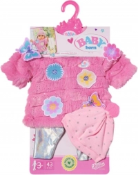 Hold din dukke varm i et charmerende BABY born sæt til 43 cm dukker. Sættet indeholder en superblød lyserød pels med glimmer, metallisk skinnende leggings og en hu e med kvast. Dekorative blomster- og sommerfugleapplikationer giver outfittet charme og stil, mens materialer af høj kvalitet sikrer behagelig påklædning og lang holdbarhed ved daglig leg.