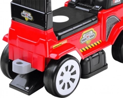 Anhænger kobles let på og har huller til opbevaring af de medfølgende redskaber – skovl og rive. Under sædet finder du et praktisk gemmerum til små skatte. Drejelige forhjul gør styringen nem og understøtter udviklingen af motorik og fantasi under legen.