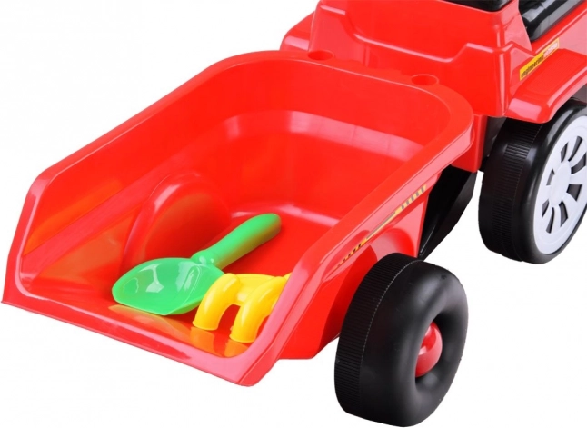 Der medfølger en aftagelig anhænger med holdere til skovl og rive. Børn kan transportere legetøj, sand eller småting i haven og derhjemme.