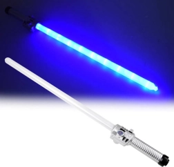 Let og holdbart lyssværd på 66 cm med blå bagbelysning og realistiske lydeffekter begejstrer små fans af galaktiske eventyr. Med en ergonomisk sølvfarvet håndtag, medfølgende AAA-batterier og CE-certificering er det klar til øjeblikkelig sjov derhjemme og som tilbehør til kostumer.