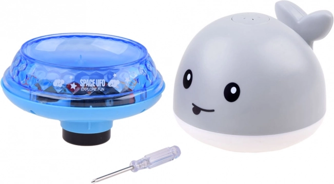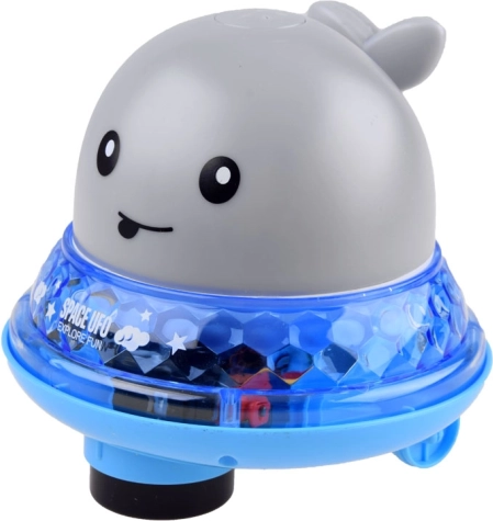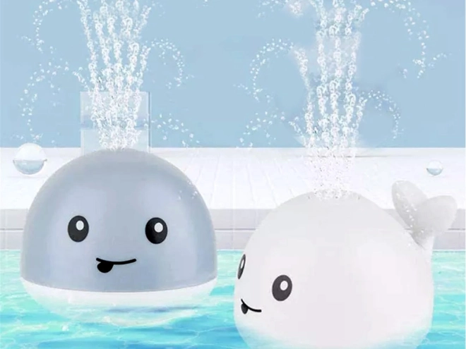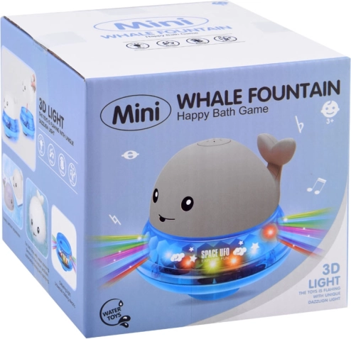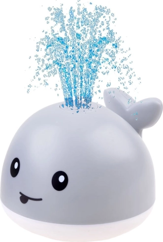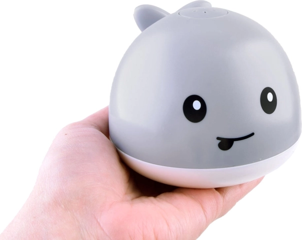 Den søde vandhval gør hvert bad til en leg. Når den nedsænkes, aktiveres den automatisk, sprøjter vand som en mini-fontæne og ledsages af farverige LED-lys. Placeres den på platformen, kører den af sted, bevæger sig i takt med munter musik og lyser op – perfekt til badekar, pool og sjove stunder på badeværelset.
