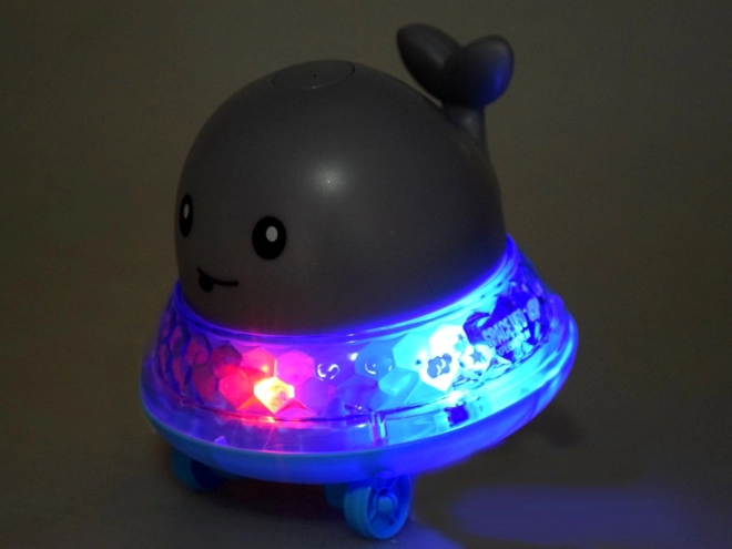 Denne smarte legeting kombinerer vandleg med bevægelse og lys. Ved kontakt med vand starter hvalen automatisk en vandsøjle og lyser i klare farver, som børn elsker. Uden for vandet placeres den blot på den medfølgende kørende platform, tænd kontakten, og se den køre på gulvet ledsaget af musik og lyseffekter.