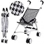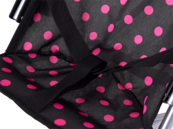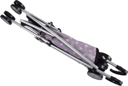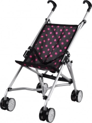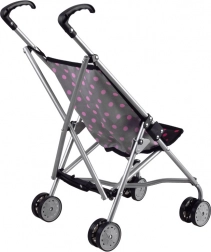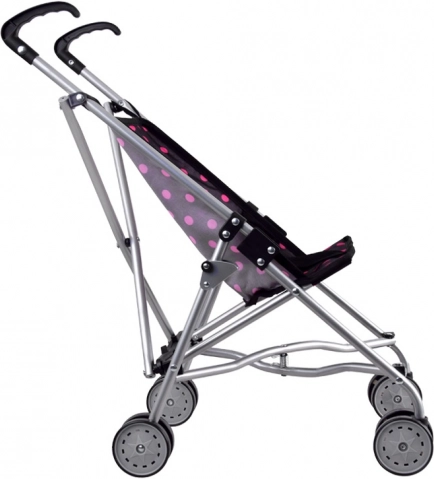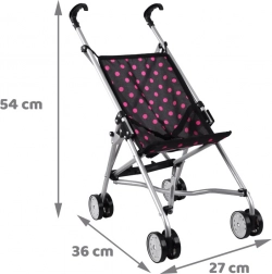 Det tekstile sæde i moderne sort med lyserøde prikker er holdbart og behageligt at røre ved. Dobbelthjulene giver en glat kørsel og god manøvredygtighed på forskellige overflader. Sikre folde-/udfoldningsdele og stropper i sædet hjælper med at holde dukken på plads.