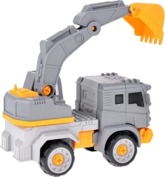 Der medfølger en skruetrækker og en reserveskrue. Børn kan skrue hjul, front, kabine med arm og skovl af og samle det hele igen.