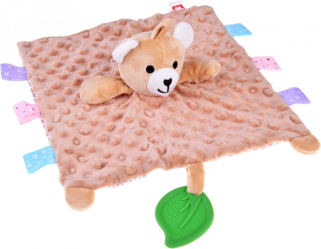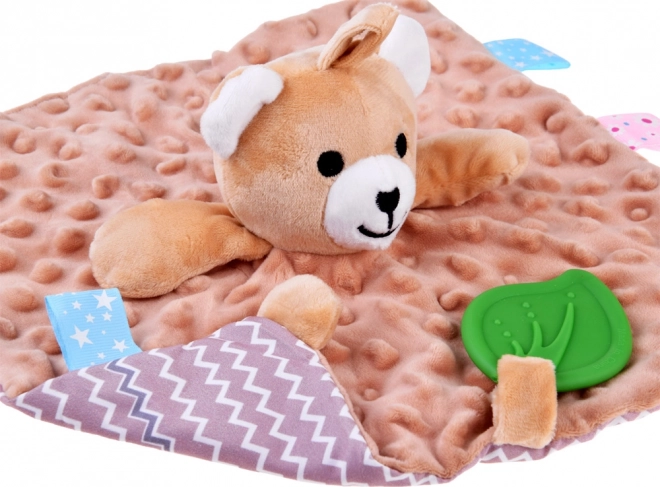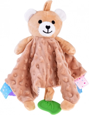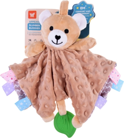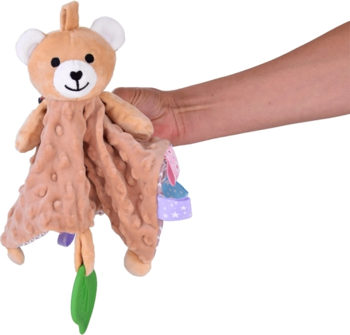 Den nuttede plyssede kramme- og putteklud i form af en bjørn giver blid beroligelse og sansestimulering fra barnets allerførste dage. Den har blød minky med 3D-prikker, farvede mærkebånd til leg, en silicone bidering der lindrer gummerne, samt knitre- og piveelementer, som vækker nysgerrighed og understøtter sanseudviklingen.