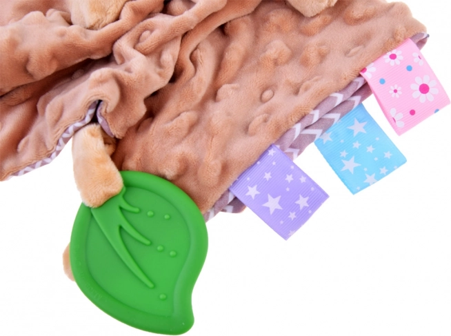 Denne bløde putteklud kombinerer komforten ved et krammetæppe med en sansestimulerende legetøjsoplevelse. Barnet fanges af de forskellige teksturer, knitrende og pivelyde samt farvede bånd langs kanterne, der indbyder til at røre, kramme og trække. Det grønne siliconeblad fungerer som bidering og hjælper med at massere de følsomme gummer under tandfrembrud.