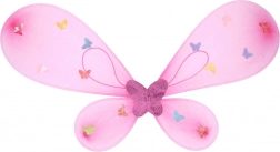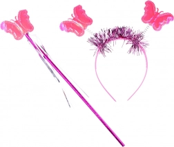 Klar lyserøde vinger med farverige sommerfugle suppleres af en matchende tryllestav og hårbøjle – alt i en harmonisk fe-stil.