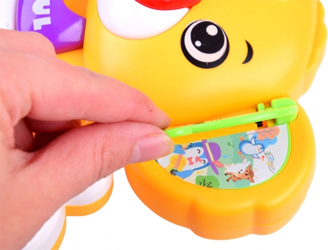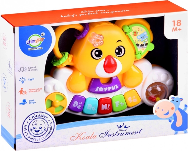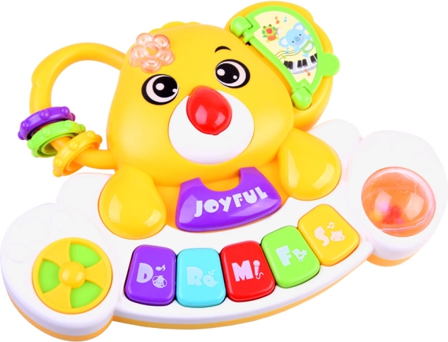 Dette farverige, interaktive klaver kombinerer læring og leg. Børn bliver fortrolige med den grundlæggende skala Do–So, lytter til glade melodier og autentiske dyrelyde (hund, hane, hest, kat, elefant). Hvert tastetryk ledsages af et blinkende lys, der skifter farve og støtter den visuelle perception.