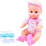 Dukken er klædt i en behagelig body med blødt hårbånd og sokker. I pakken finder du også potte, ble, hagesmæk, sutteflaske og sut, så intet står i vejen for fuld pleje. Størrelsen på ca. 30 cm er ideel til små børnehænder og let at bære.