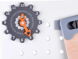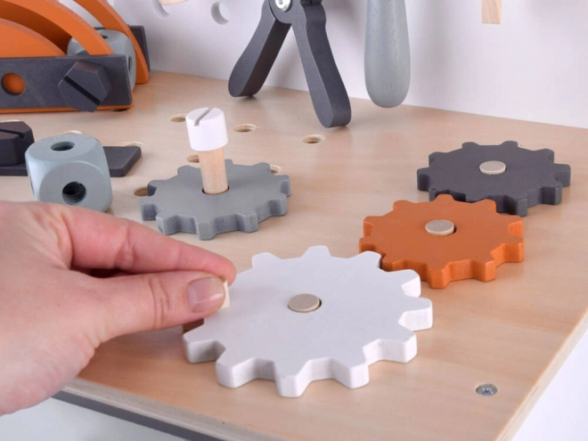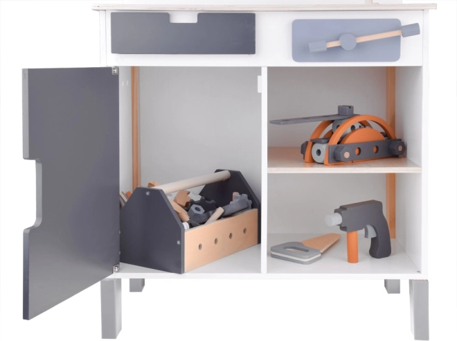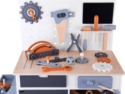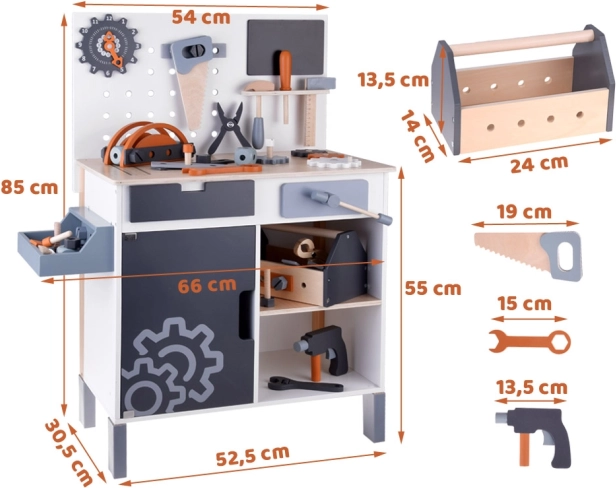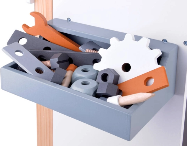 Bordet er udstyret med opbevaringsrum og pegboard, som lærer børn, hvordan man effektivt organiserer deres værktøjer og tilbehør.