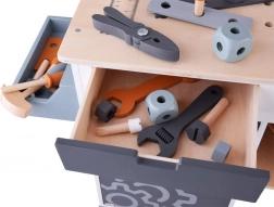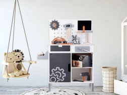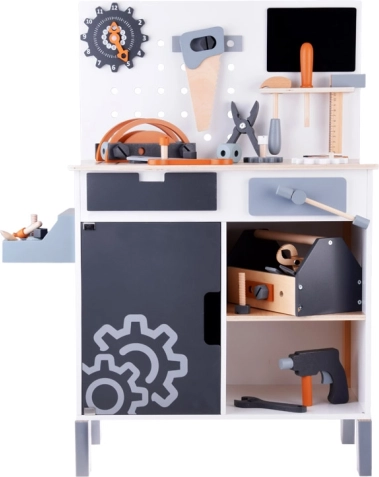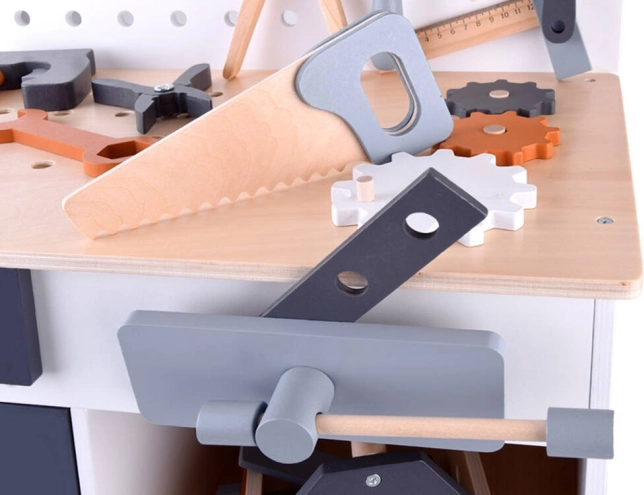 Træværkstedsbord til børn udgør det perfekte legetøj til udvikling af kreativitet og finmotorik. Med et bredt udvalg af værktøjer, såsom sav, hammer, skruetrækker og meget mere, kan børn dykke ned i en verden af gør-det-selv lege og simulering af et rigtigt arbejdsmiljø.