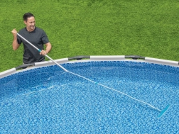 Bestway poolrensningsbørste er designet til at hjælpe dig med at sikre renligheden og vedligeholdelsen af poolen. Den har stærke hvide børstehår og et robust turkist håndtag, der muliggør effektiv skrubning af overflader. Takket være det buede design kan du nemt nå vanskeligt tilgængelige steder.