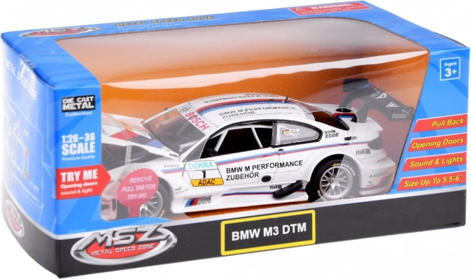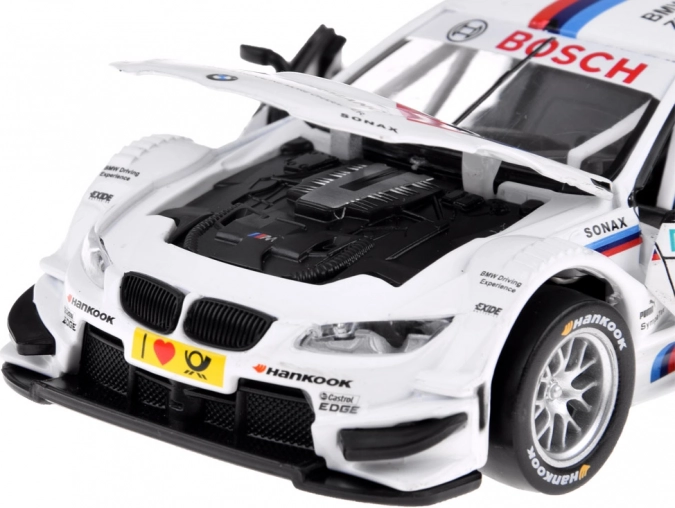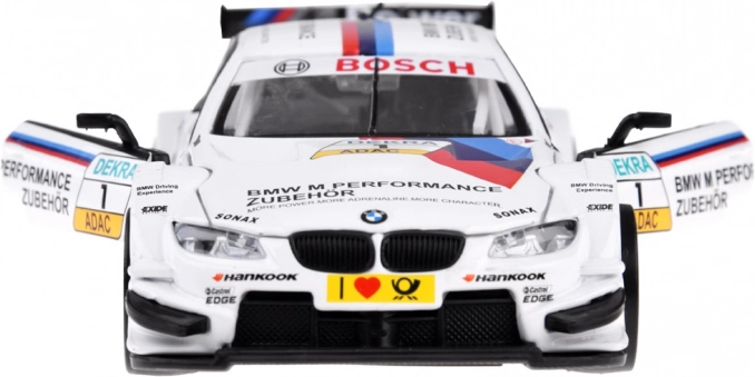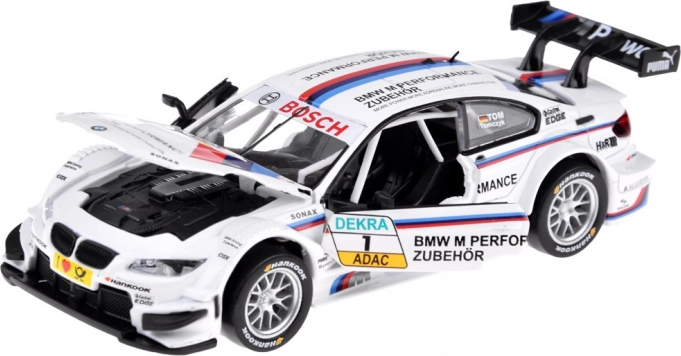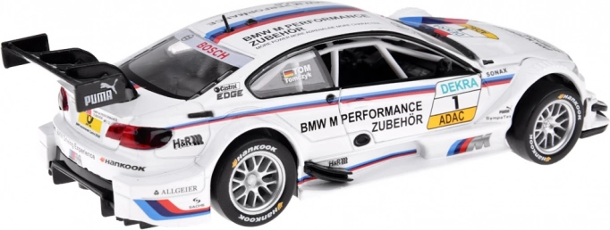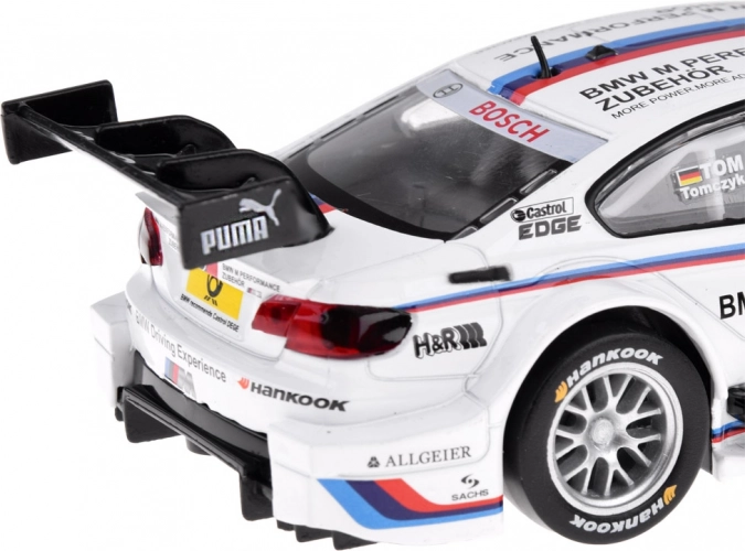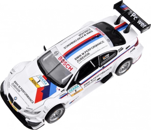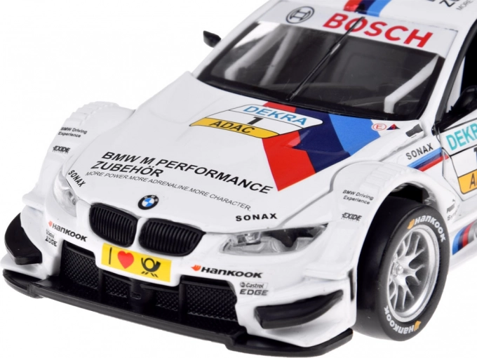 Realistisk BMW M Performance-bemaling, sponsorlogoer, bagvinge og race-livery giver modellen et troværdigt look til både leg og udstilling.