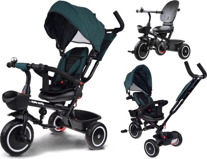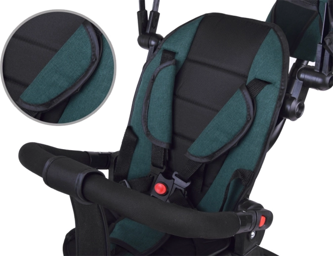 Denne multifunktionelle 3-i-1 trehjuler kombinerer klapvogn, løbecykel og klassisk trehjulet cykel. Takket være det drejelige og justerbare sæde, den bløde betrækning og 5-punkts selerne er turen maksimal komfortabel og sikker for små passagerer. Den sammenklappelige kaleche med ventilationsnet beskytter mod sol, vind og let regn.