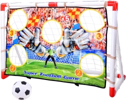 Et sjovt og holdbart træningsmål til børn med farverig skuddug, der hjælper med at udvikle skudpræcision, hastighed og koordinering. Komplet sæt i let plast indeholder mål med net, mål-dug, bold, pumpe og pløkker til fastgørelse – ideelt til haven, parken og banen.