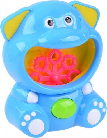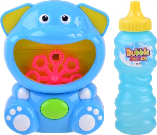 Hæld opløsningen i åbningen, tryk på knappen på elefantens mave, og se skiven rotere, mens en strøm af regnbuefarvede bobler flyver ud.