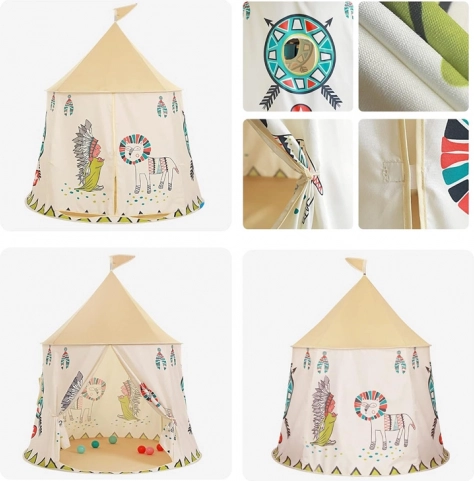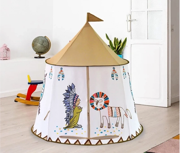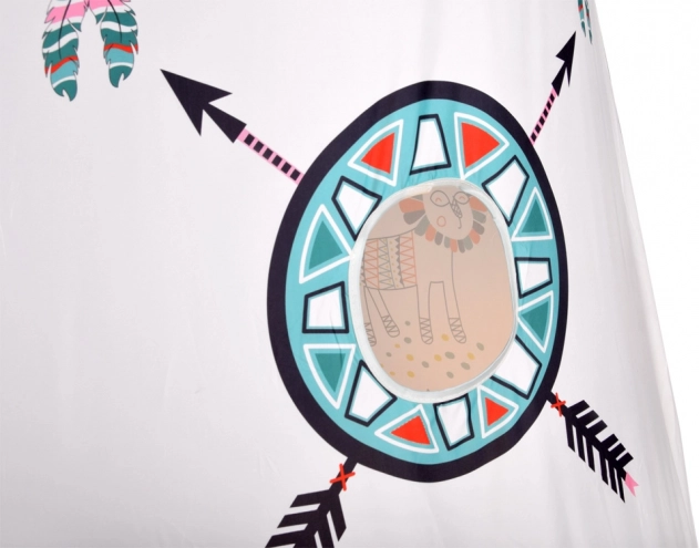 Dette runde tipi-telt med legesyge indianske prints forvandler værelset til et magisk hjørne til læsning, rolleleg og afslapning. Den lette konstruktion sikrer nem montering/afmontering og flytning efter behov, mens den åndbare tekstil giver et behageligt klima under legen.