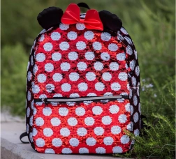 Rygsækken med det karakteristiske Minnie-mønster i rød og hvid med polkaprikker, pyntet med rød sløjfe og glitrende ører, er virkelig magisk.