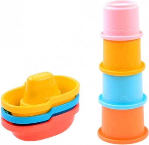 Byg, hæld og kapsejl. Stablekopper med huller og tre flydende både stimulerer fantasien og sjove eksperimenter med vand.