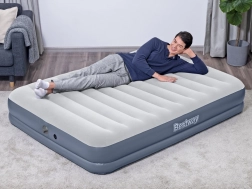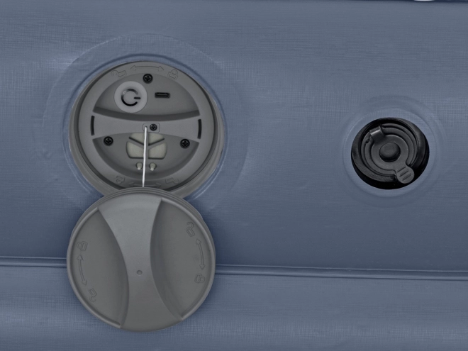 Den indbyggede, aftagelige akkumulatorpumpe oplades via USB, puster madrassen op på cirka 4 minutter og klarer op til to fulde oppustninger på en opladning. Oversiden er belagt med et blødt vinylmateriale for ekstra komfort og en behagelig berøring.