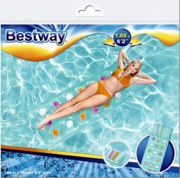 Nyd sommeren fuldt ud med BESTWAY oppustelig madras med integreret pude. Den tilbyder behagelig liggekomfort, en stabil konstruktion af slidstærk PVC og en maksimal belastning på op til 90 kg. Det farverige design lyser enhver pool og strand op, og takket være de kompakte mål kan du nemt tage den med overalt.