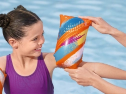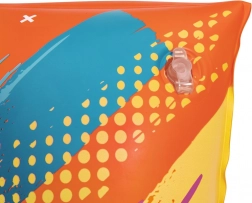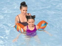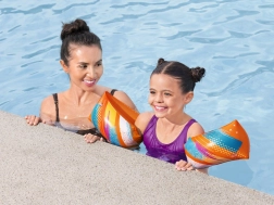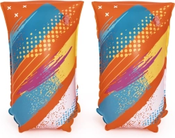 Farverige oppustelige svømmevinger BESTWAY L/XL med sommerfuglemotiv til børn fra 5 til 12 år giver sikker støtte under svømmeindlæring. Takket være 2 uafhængige luftkamre og holdbart TPU-materiale er de lette og komfortable samt godt synlige med den klart orange farve.