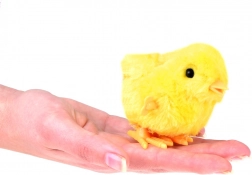 Kyllingen er dækket af blød syntetisk pels, der efterligner naturlig fjer.