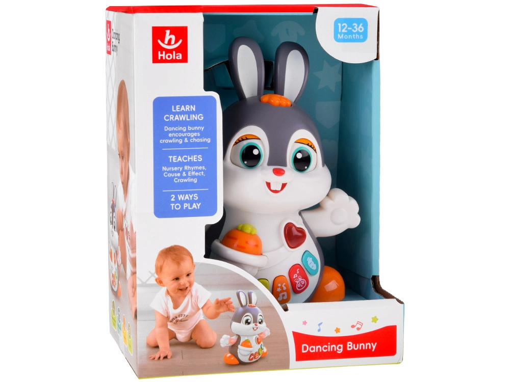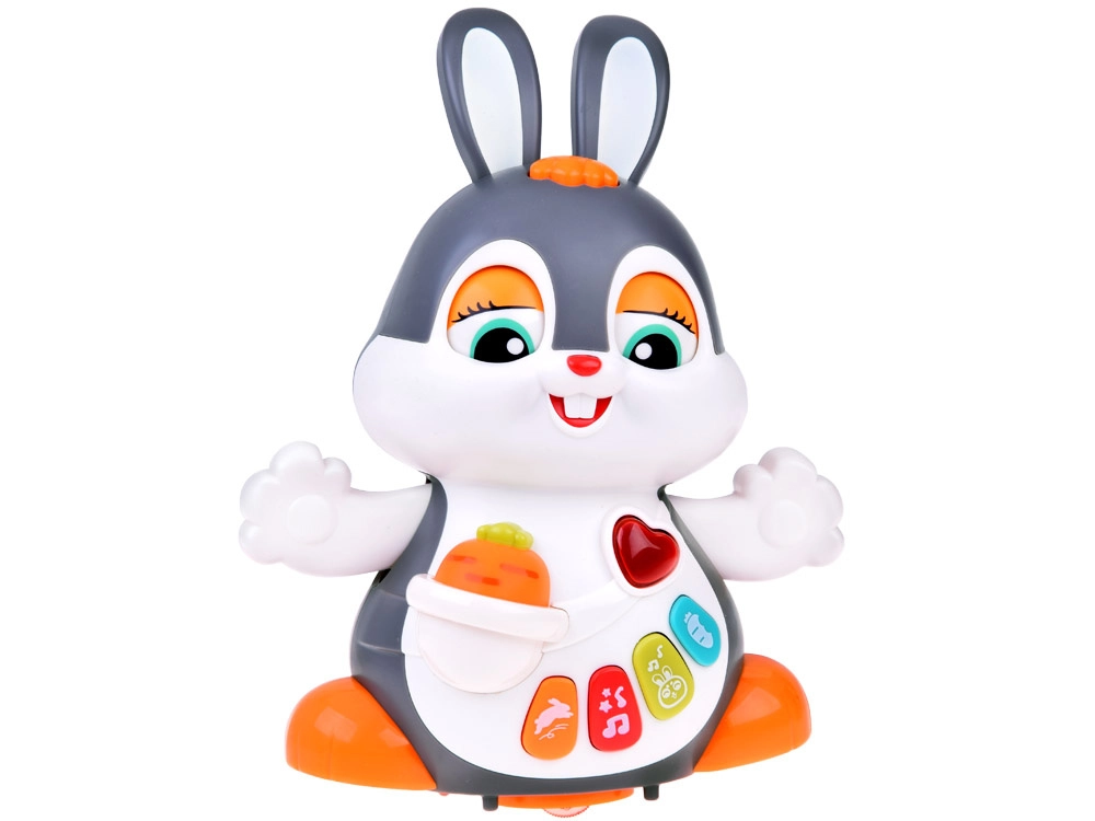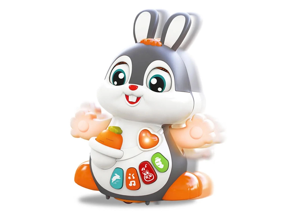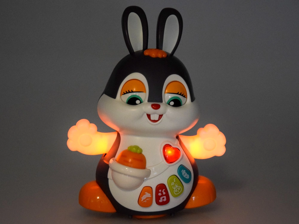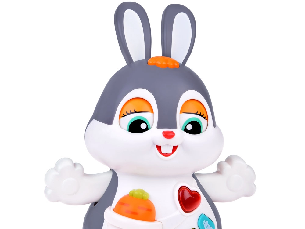 Den interaktive dansende kanin er en skøn ledsager til de første skridt og til at kravle. Legetøjet kan bevæge sig, blinke med øjnene og lyse i takt med musikken. Børn bliver fanget af de farvede knapper med forskellige funktioner: melodier, hjerteslag, lyde af hop eller gnavning af gulerod – alt ledsaget af lyseffekter.