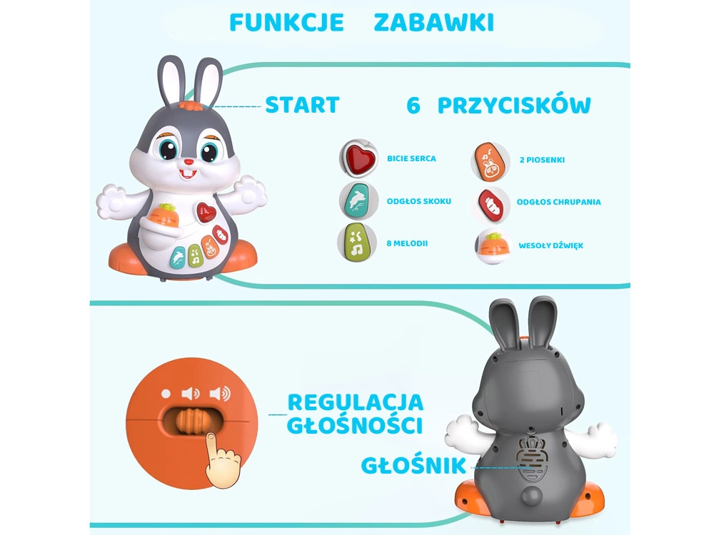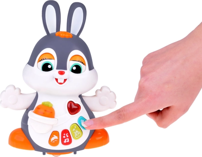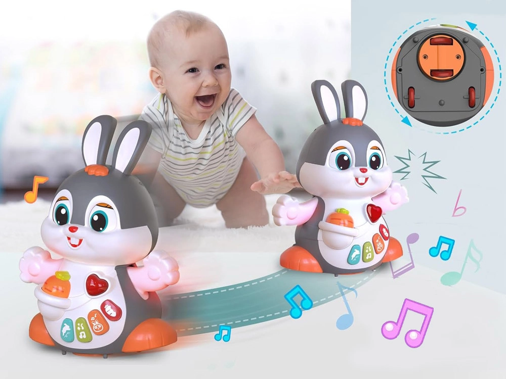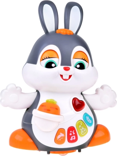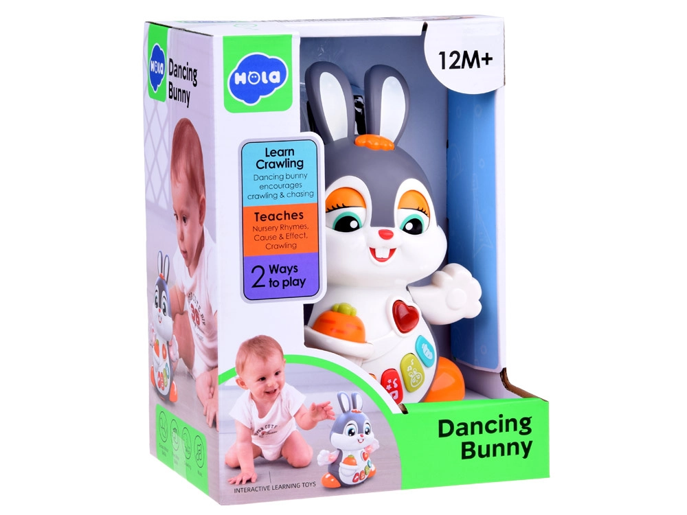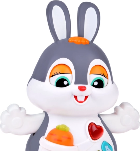 Den interaktive dansende kanin er en skøn ledsager til de første skridt og til at kravle. Legetøjet kan bevæge sig, blinke med øjnene og lyse i takt med musikken. Børn bliver fanget af de farvede knapper med forskellige funktioner: melodier, hjerteslag, lyde af hop eller gnavning af gulerod – alt ledsaget af lyseffekter.