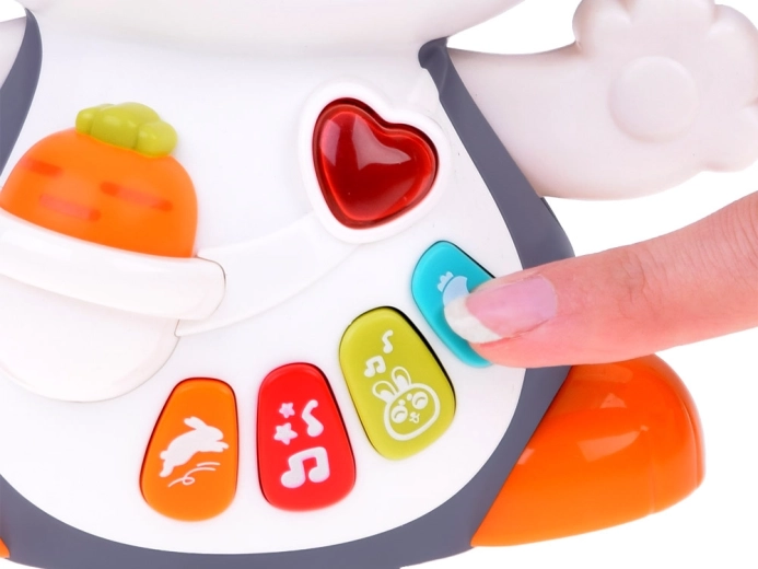 Farvede knapper udløser forskellige melodier og lyde (hjerteslag, hop, gnavning af gulerod), ledsaget af blinkende lys – ideelt til sansestimulering.