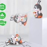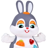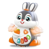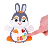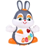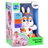Egenskaber:- Musik og lys: Kaninen danser til rytmen af glade sange og blinker med farvede lys, hvilket stimulerer barnets sanser og giver underholdning.