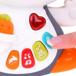 Funktioner for farvede knapper:- Orange knap på hovedet - tænder legetøjet. Kaninen begynder at køre og danse, blinker med øjnene og bevæger poterne. Hjertet og poterne lyser i takt med musikken.