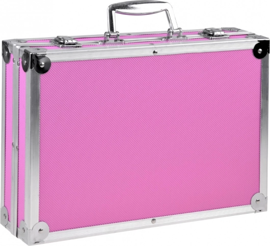 Opbevaret i en pink og sort kuffert, der sikrer nem transport og orden.