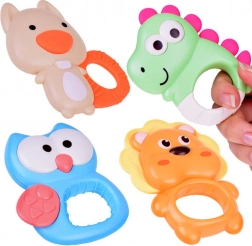 Vælg mellem motiverne: orange løve, blå ugle, grøn dinosaurus og beige egern. Glade farver understøtter sanseudviklingen.