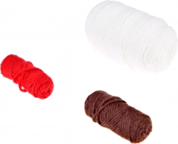 3 bomuldsgarner (ekru, brun, rød), fyld, hæklenål 2,5 mm, dobbelt‑endet hæklenål, sikkerhedsnål, sikkerhedsøjne, 5 sikkerhedsnåle/markører, illustreret vejledning med QR‑kode til video