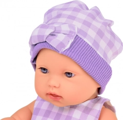 Sættet er farvemæssigt afstemt i elegant grå med fine tern: dukken bærer hue, kjole og sokker, plyskaninen har en nederdel i samme stil, og tekstilkurven fuldender helhedsindtrykket. Takket være de bevægelige lemmer kan dukken nemt sættes op eller lægges, hvilket udvider lege-mulighederne.
