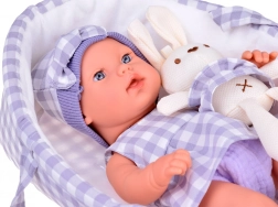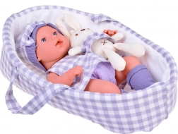 Denne detaljeret udførte babydokke understøtter kreativ leg, udvikling af fantasi og empatiske færdigheder. Fine ansigtstræk og realistiske proportioner forstærker følelsen af at tage sig af en rigtig baby. Den matchende kurv med hanke gør transport og opbevaring let både hjemme og på farten.
