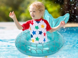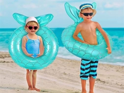 Den turkise farve og skalmønsteret vækker opsigt på stranden og ved poolen og motiverer børn til aktiv leg i vandet.