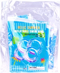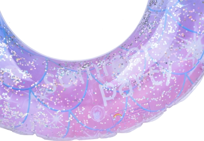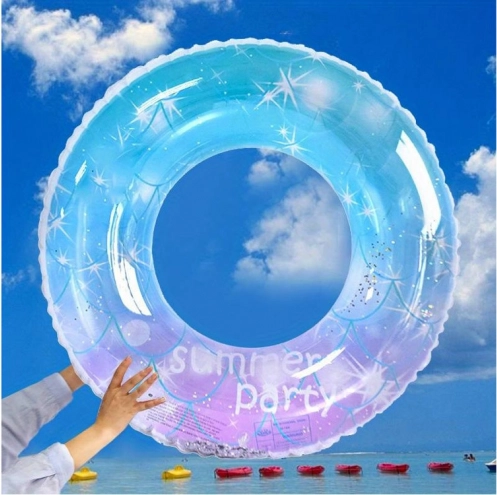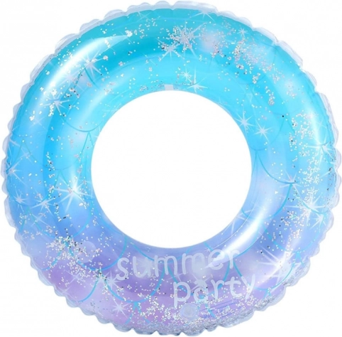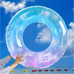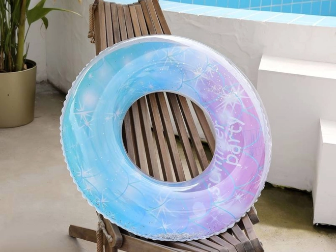 Den gennemsigtige ring med blå‑rosa farveforløb og “summer party”‑glitter lyser op ved poolen og på stranden og glæder hvert eneste barn.