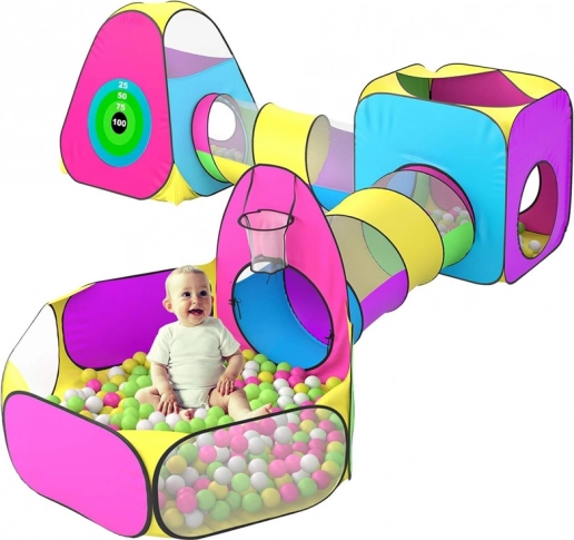 Det modulære 5-i-1 børnecenter giver uendelige muligheder. Tre farverige telte og to fleksible tunneler kan forbindes og bygges om efter behov – fra en lille kravle- og forhindringsbane til en stor gigantisk legeplads på over fire meters længde. Takket være pop-up konstruktionen tager opsætningen kun et øjeblik, og efter legen pakkes alt nemt i den medfølgende taske.