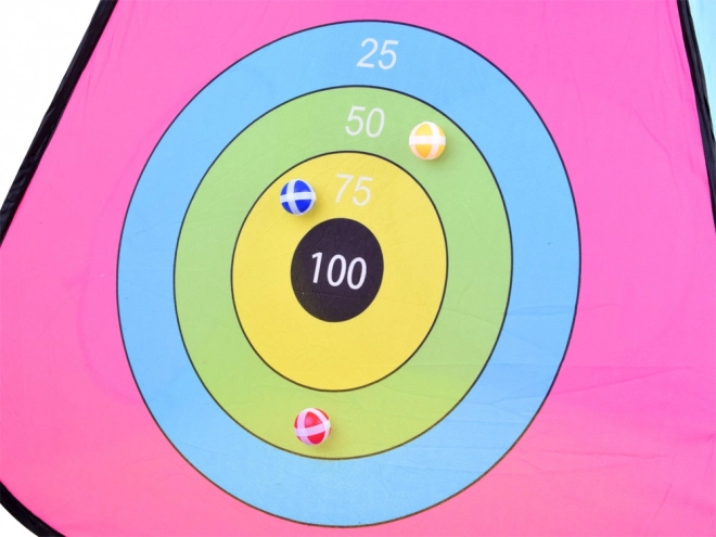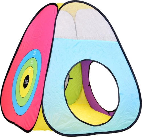 Det trekantede telt med farvet målskive og kaståbninger udvikler præcision og finmotorik. Suveræn konkurrenceleg for små skarpskytter.