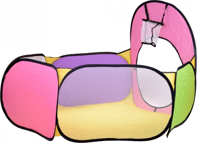 Hvert telt byder på forskellige aktiviteter: det trekantede telt med målskive og kaståbninger til velcrobolde, det firkantede telt med to indgange og mulighed for tunneltilslutning samt telt – boldbassin/legegård, ideelt som tørboldbassin (bolde medfølger ikke). Farvede paneler og netsektioner understøtter visuel stimulering og gør det let for voksne at holde opsyn.