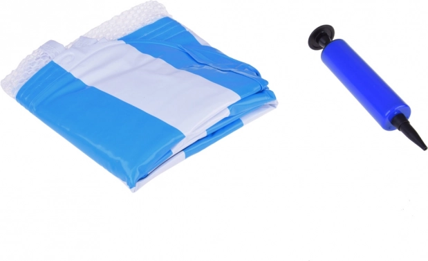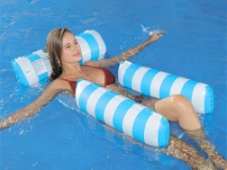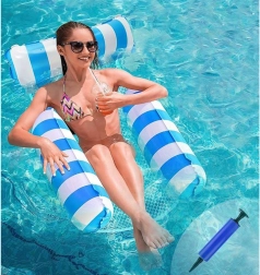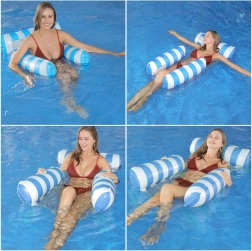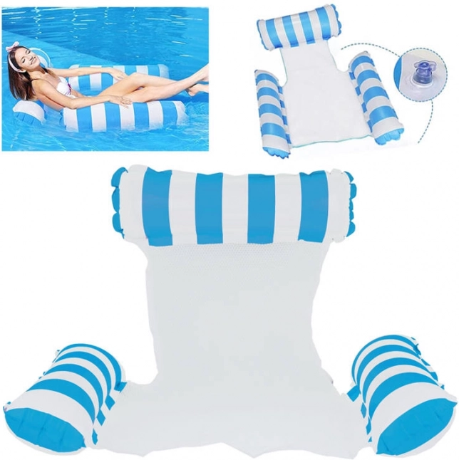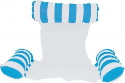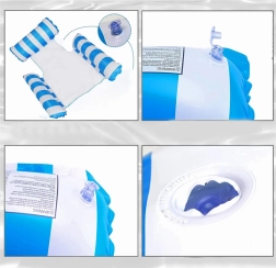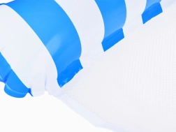 Kassér den almindelige flydemadras og omfavn en unik løsning - en hængekøjestil flyder, ideel til varme sommerdage. Designet så du delvist kan nedsænke dig i vandet, så du altid er behageligt afkølet under solbadning. Flyderen er udstyret med oppustelige dele lavet af holdbart PVC og forbundet med en nylonnet for maksimal komfort. Dens elegante blå-hvide design vil pryde dine ferie-fotos.