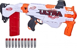 NERF Ultra Focus leverer dynamisk skydning og flydende action takket være den elektriske drift. Det er nok at trykke på accelerationsknappen, sigte med det integrerede sigte og trykke på aftrækkeren – pilene affyres én efter én. Magasin til 10 pile sikrer længere leg uden afbrydelser.