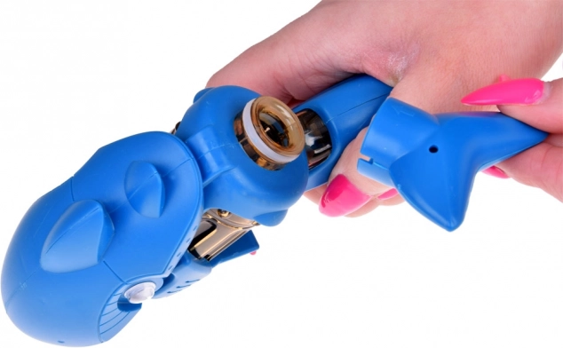 Betjeningen er helt enkel: Skru halen af, hæld vand i beholderen, luk igen og tryk på den røde aftrækker. Den gennemsigtige beholder gør det muligt for børn altid at tjekke, hvor meget vand der er tilbage. De bevægelige hajøjne giver legetøjet en sjov effekt ved hver bevægelse.