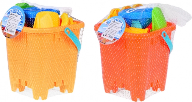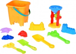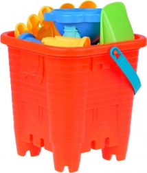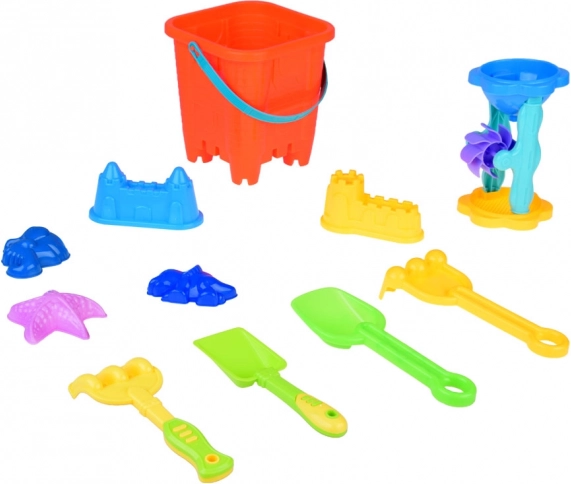 - 1× slotformet spand, 5× form (2× borg, søstjerne, dinosaur, søhest), 2× skovl, 2× rive, 1× mølle