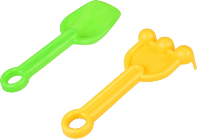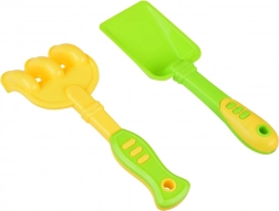 - Komplet udstyr: 2 skovle, 2 river, 5 forme (2× borg, roset/søstjerne, dinosaur, søhest) og mølle.